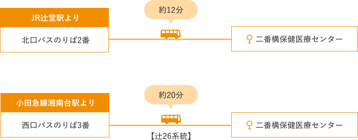 辻堂駅から「二番構保健医療センター」へ向かうには、辻堂駅北口の2番のりばから、神奈川中央交通バスの以下の系統をご利用ください。