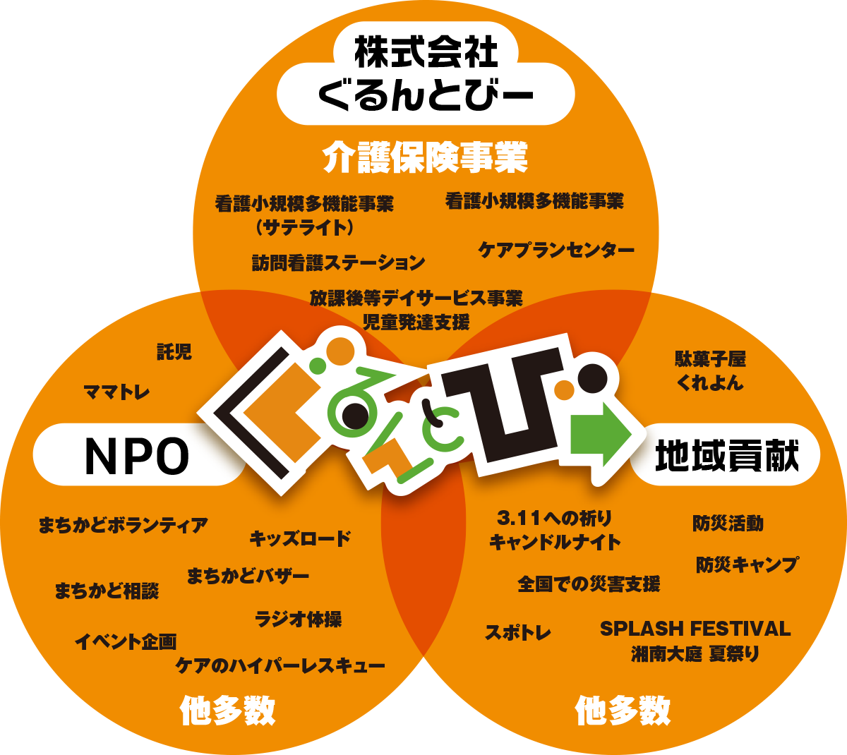 株式会社として専門的な介護・看護を。NPO法人として制度の外の支え合いを。そして地域住民として、隣人としての温かさを。3つの顔で動くぐるんとびーは、この町を一つの家族にする地域デザインです。